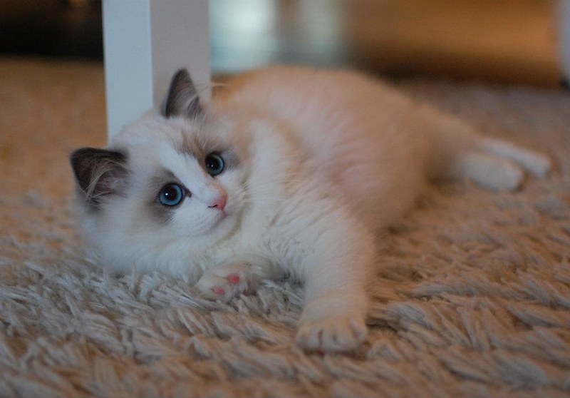 Все котята рэгдоллов белые и похожи на бирманцев. Окрас проявится ближе к 2 годам. Порода характеризуется замедленным развитием в физическом и половом плане.